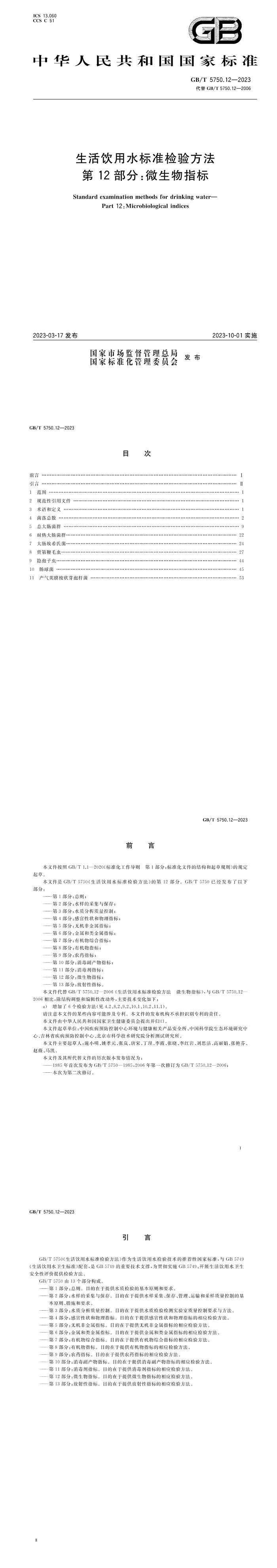 GB/T 5750.12-2023生活飲用水標(biāo)準(zhǔn)檢驗(yàn)方法第12 部分:微生物指標(biāo)